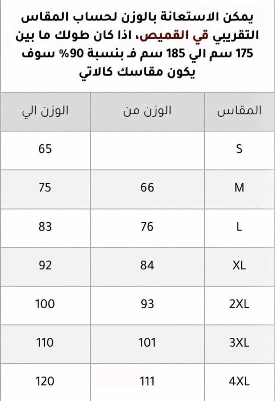 جدول مقاسات القميص